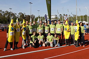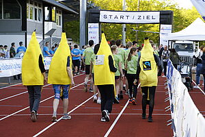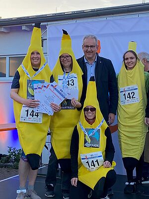 Sowohl mit Lauf-Teams als auch mit einem Informationsstand im Waldstadion war die Steuerungsgruppe vertreten. Die von der Fairtrade-Stadt Hockenheim ausgeliehenen Bananenkostüme sorgten für eine besonders gute Sichtbarkeit.